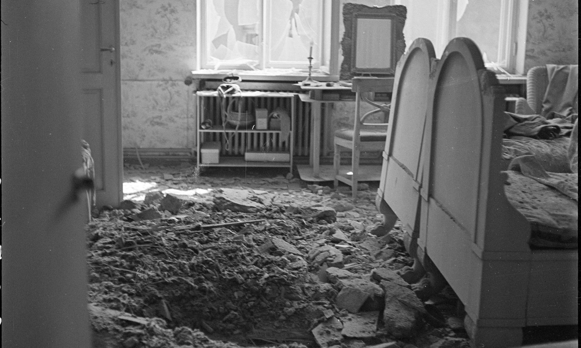 Bombkrater i sovrummet på Fredsgatan 7 i Helsingfors 1941.