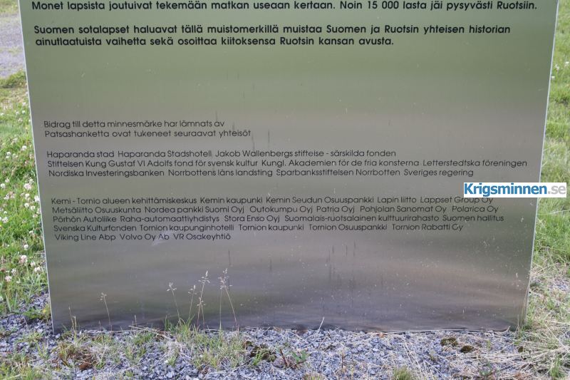 Minnesmärket står i Haparanda, ett par hundra meter från gränsövergången på den svenska sidan. Bredvid den står även ett minnemärke tillägnat alla de svenska frivilliga som har bistått Finland 1918, 1939-1940 och 1941-1945.