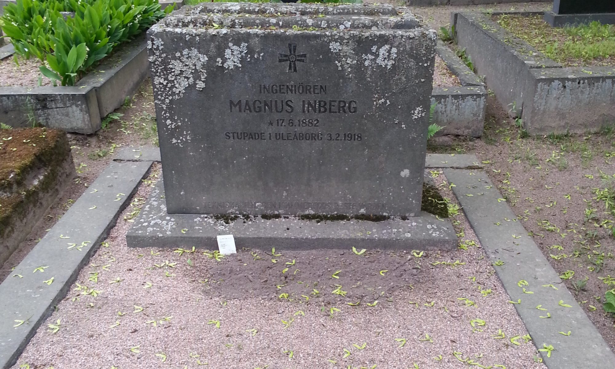 Under en av mina många kyrkogårdsvandringar på Sandudds begravningsplats i Helsingfors hittade jag denna gravvård, till minne av Magnus Inberg som stupade under frihetskriget i Uleåborg 3.2.1918.