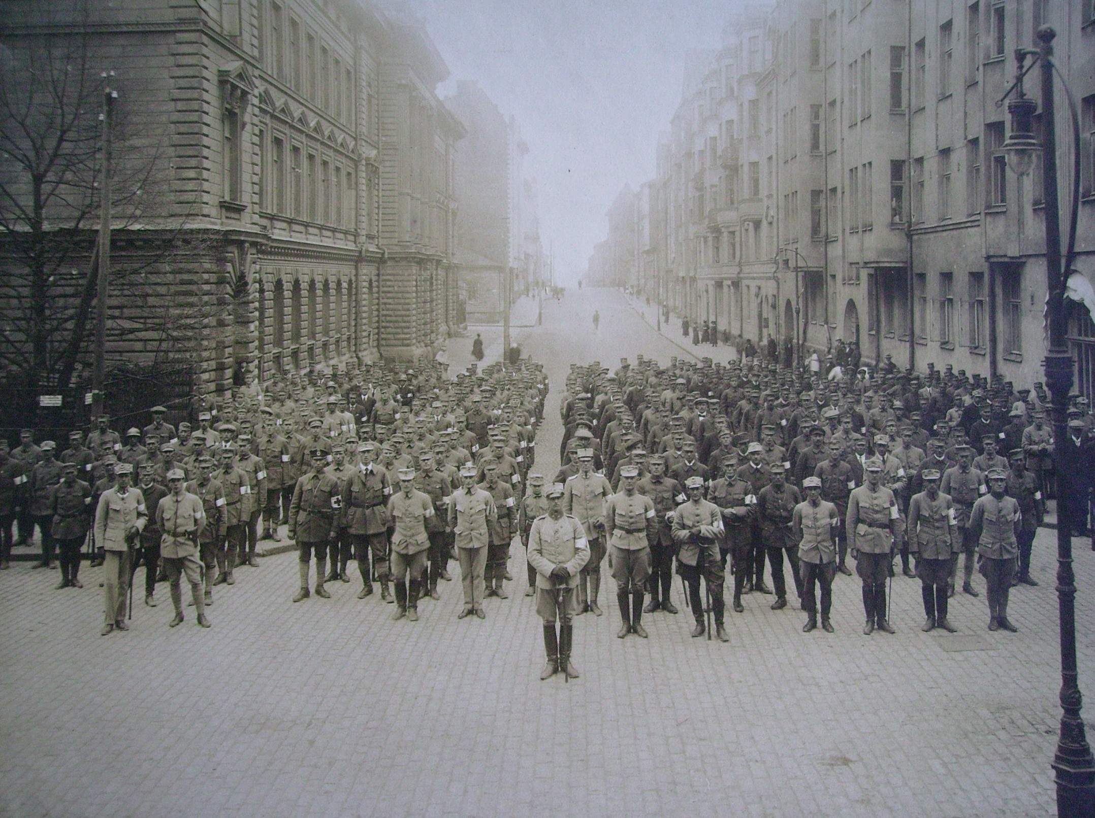 Bild: Svenska brigaden uppställd i Helsingfors den 16 maj 1918. Allan Winge står i täten.