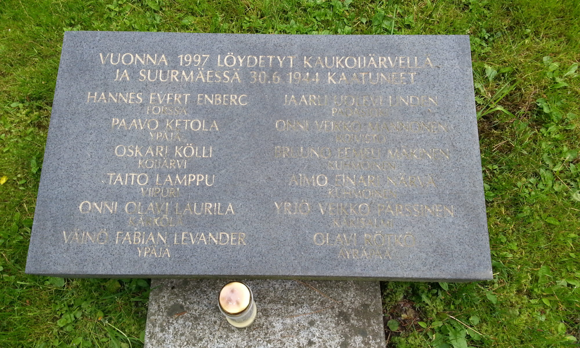 Till minne av de finska soldater som stupade den 30 juni 1944 i Kaukoijärvi och Suurmäki och vars kvarlevor hittades 1997. Minnesstenen är placerad på Sandudds begravningsplats.